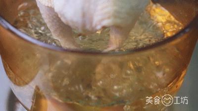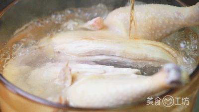 3. 再准备一锅清水,水烧开后将鸡放入锅中(水量多一点,要不过鸡身),盖上大火煮沸。 45 几分钟(直到木筷子插在肉最厚的地方,一插就可以了)。用小火煮。 5 几分钟,熄火,不开盖焖。 10 分钟。