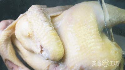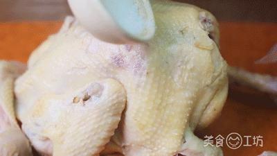 4.10 几分钟后,打开盖子,再开一次大火煮至煮沸,捞出鸡肉。趁热把盐均匀地涂在鸡肉内外,用热量使盐融化。