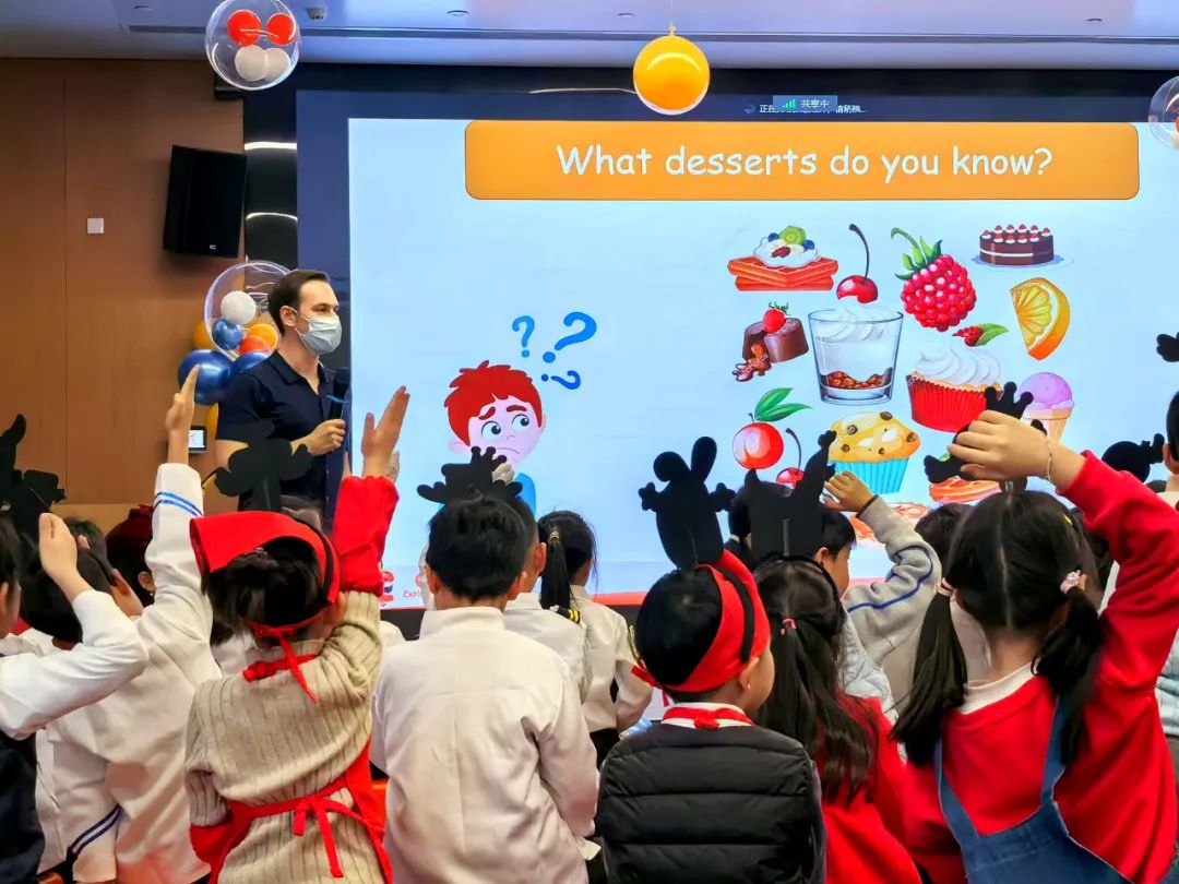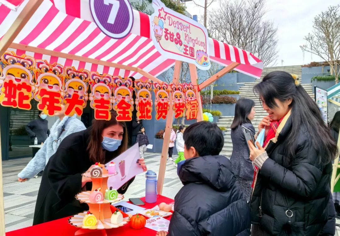 同一天,学校还建立了新年、理想、甜点、动物、水果等多元素主题摊位。外教扮演摊主,学生扮演顾客,在父母的带领下,他们高兴地“参观大集”。第一(1)班的学生董书侨参观了每个摊位。“我最喜欢的是理想的职业店。这个摊位的名字听起来很自豪。” 董书侨说。