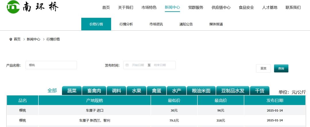 经查询南环桥农产品批发市场官网了解到,近一个月来,进口樱桃的市场参照批发价从86-200元/KG降至30-96元/KG。KG,最大降幅达65%;参照批发价从181.8元/KG降至79.5元/KG的新西兰、智利樱桃最低市场KG。