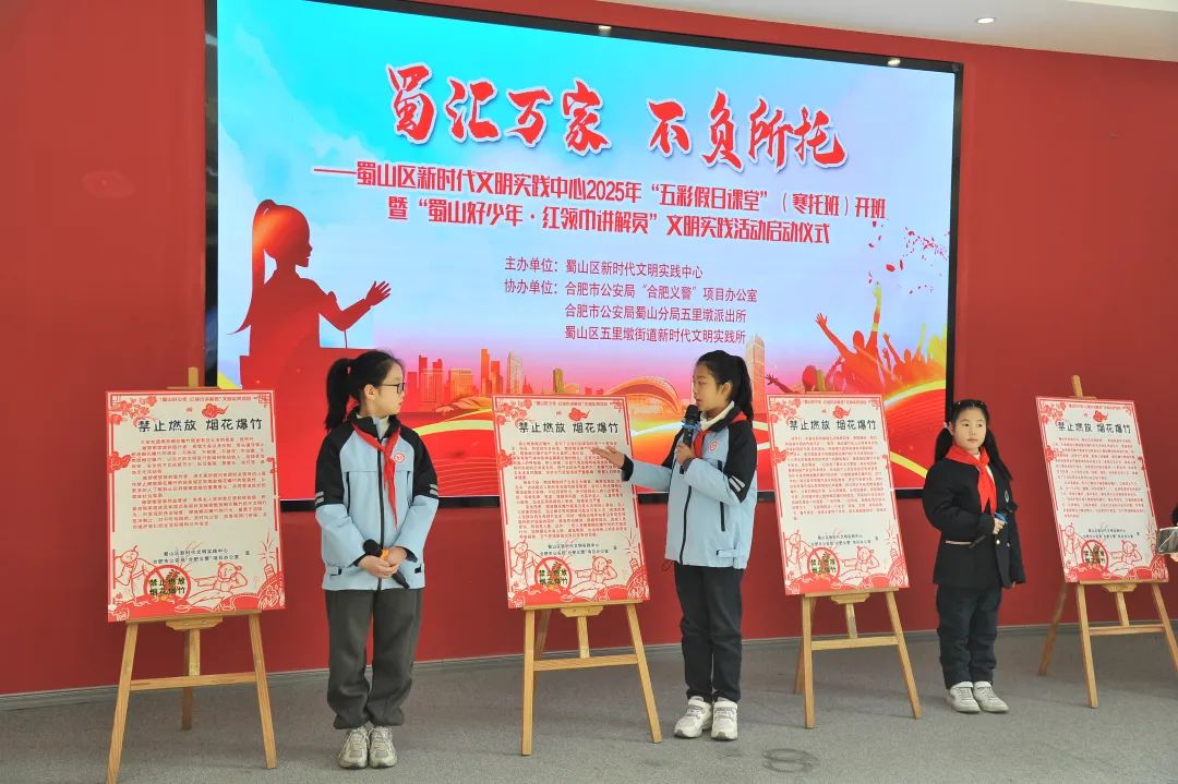 开幕式上,老中青三代志愿者大声朗读《蜀汇万家》 诗歌不负所托;青春画《我心中五彩缤纷的假日课堂》;合肥市公安局“合肥市义警”开展禁止燃烧、禁止宣传、动员文明实践活动;公益摄影志愿服务队为寒托班青少年拍摄新年祝福照。