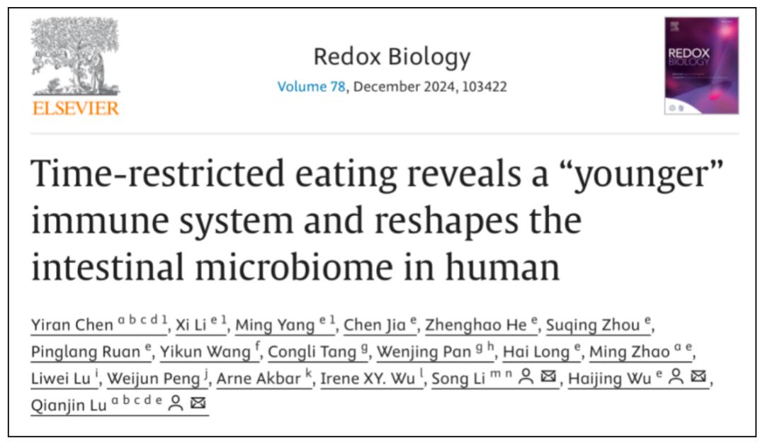 ②Time-restricted eating reveals a “younger” immune system and reshapes the intestinal microbiome in human.Redox Biology.Volume 78, December 2024, 103422