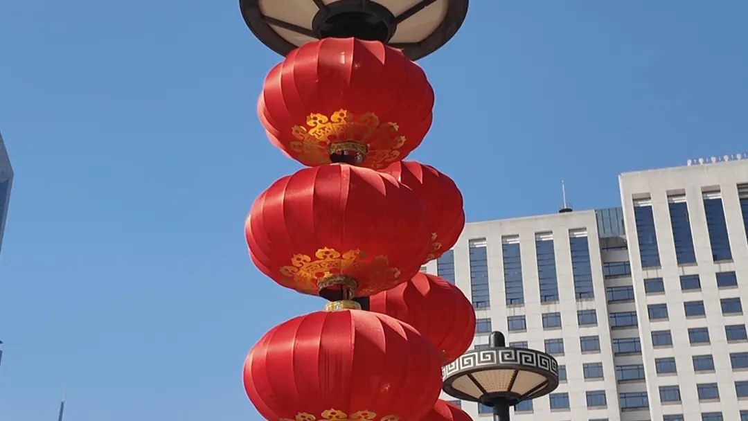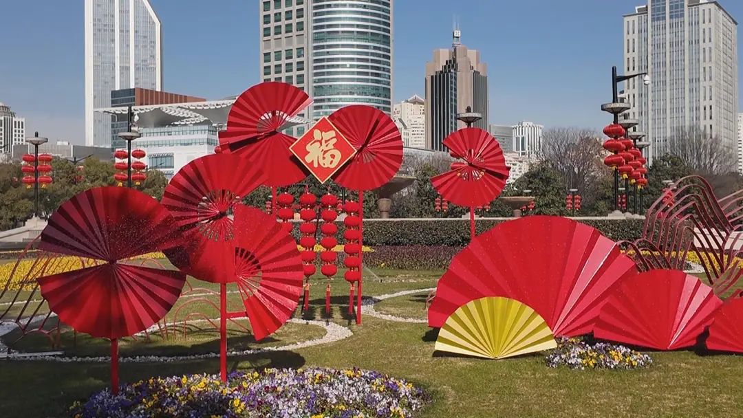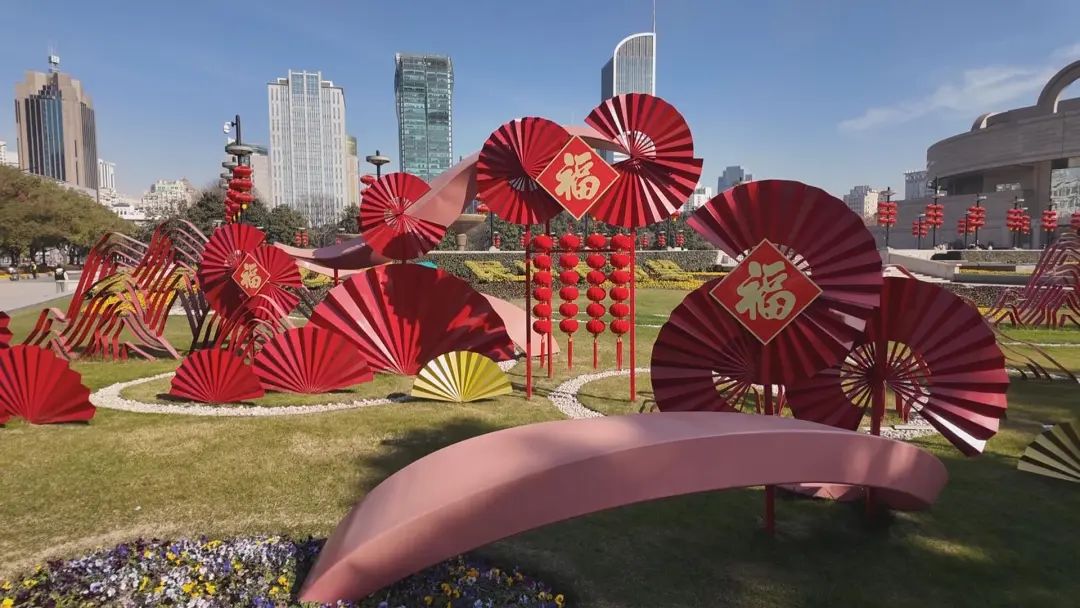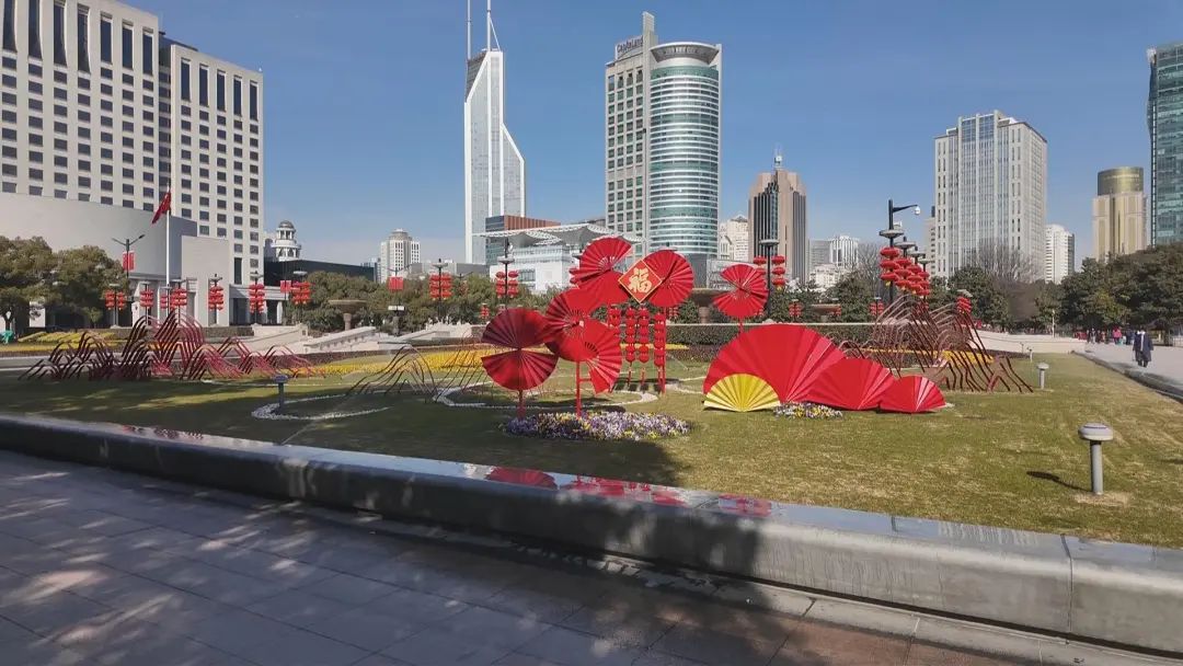五星红旗在人民大道上迎风招展,而人民广场周围则增添了许多喜庆的红色装饰。一串串大红灯笼围绕着音乐喷泉,犹如点点红星在绿意中闪烁。在喷泉旁的每一片草坪上,都精心布置了一组以红色为基调,以金色为辅助色彩的新年景观。在这些扇子中,一把把扇子变成了视觉焦点,代表着万事如意,而福字和小灯笼串则穿插其中,简洁而不失美好寓意。白色玉兰标志周围还挂满了灯笼,红色元素随处可见,将人民广场的节日气氛衬托得越来越浓。行人们纷纷驻足观看,拿出手机记录下这美好的瞬间,留下珍贵的纪念品。每个人都感叹,这些红色的点缀让人提前感受到新年的喜悦,对即将到来的春节充满期待。