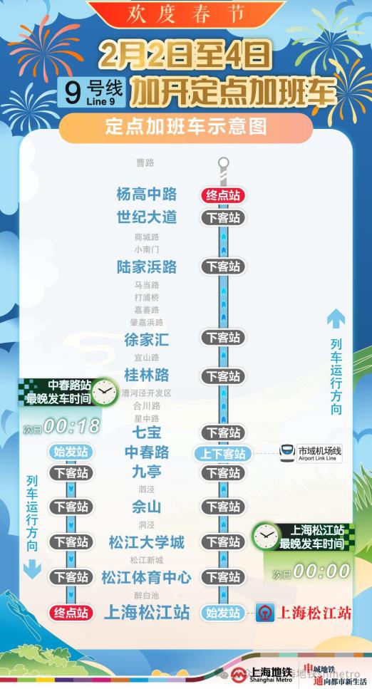 9号线上海松江站向杨高中站方向:9号线上海松江站上升末班车(222):30)后,增加5列定点加班车,停靠上海松江站、松江体育中心站、松江大学城站、佘山站、九亭站、中春站、七宝站、桂林站、徐家汇站、陆家邈站、世纪大道站、杨高中站(终点)等车站。上海松江站停靠站(始发站)、中春路站办理上下客,其它车站只下不上。