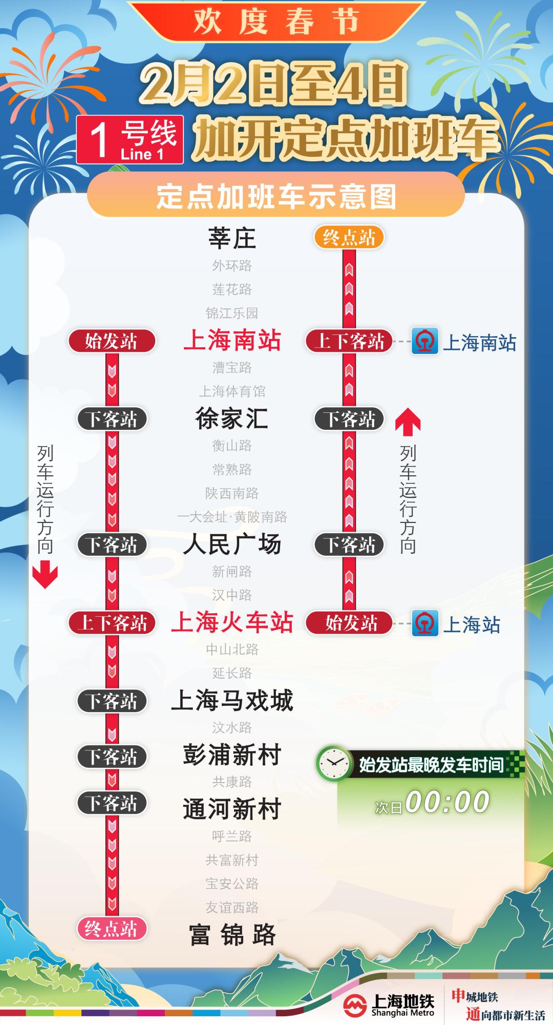 1号线上海南站向富锦路站方向:上海南站末班车(222):42)之后,向富锦路站增加了4列定点加班车。加班车停在上海南站、徐家汇站、人民广场站、上海火车站、上海马戏城站、彭浦新村站、通河新村站、富锦路站(终点)等车站。停靠站内,上海南站(始发站)、上海火车站办理上下客,其它车站只下不上。