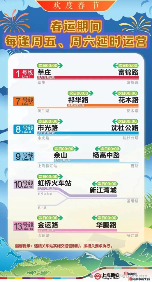 为了满足“春运高峰”期间乘客的夜间出行需求,减轻中心城市夜间高峰休闲和购物客流集中的压力,最大限度地满足乘客的节日出行需求,上海地铁1、7、8、9、10、正常的周末延迟营销计划将在13号线实施。