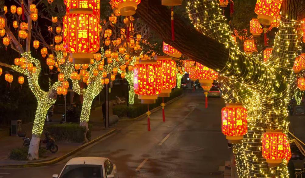 大红灯笼高高挂着,灯笼装饰着迎接新年。近日,中共青浦区委宣传部、区文明办、区绿容局、区新城公司等部门精心策划春节景观照明工程。不同形状的红灯笼和彩灯纷纷“上岗”,用绿色雕塑装饰城市,营造出欢乐祥和的节日氛围,迎接春节的到来。