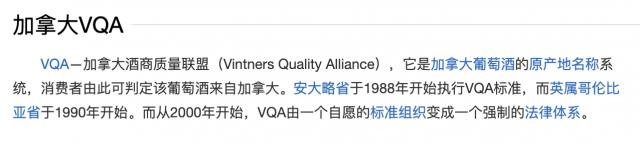 VQA 的全称是 Vintners Quality Alliance,中文是加拿大酒商质量联盟,用来表示加拿大原产地的名称体系,其等级相当于法国。 AOP。