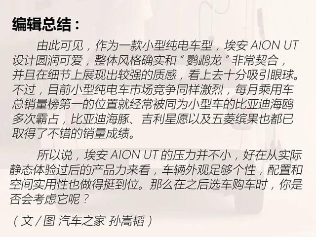 这一点可以通过上面比较详细的配置图表直观地看到。 3 车辆配置的主要区别。选型时,自然要根据自己的需要来决定。相比之下,个人比较推荐低配的。 420 智能版,价格实惠,而且设备也已足够齐全,性价比较高。若对安全性要求较高,可选择高配置。 420 智尊版,比低配贵 2 一万元,主被动安全配置更加丰富,也十分值得。诚然,上述仅根据当前预售价格进行分析,AION UT 据悉将在 2 月末正式上市,厂商上市后很可能会继续给予更多的福利政策,那么它是否吸引了你,你会选择它也是同级别的其他车型吗?请在评论区留下您的意见!
