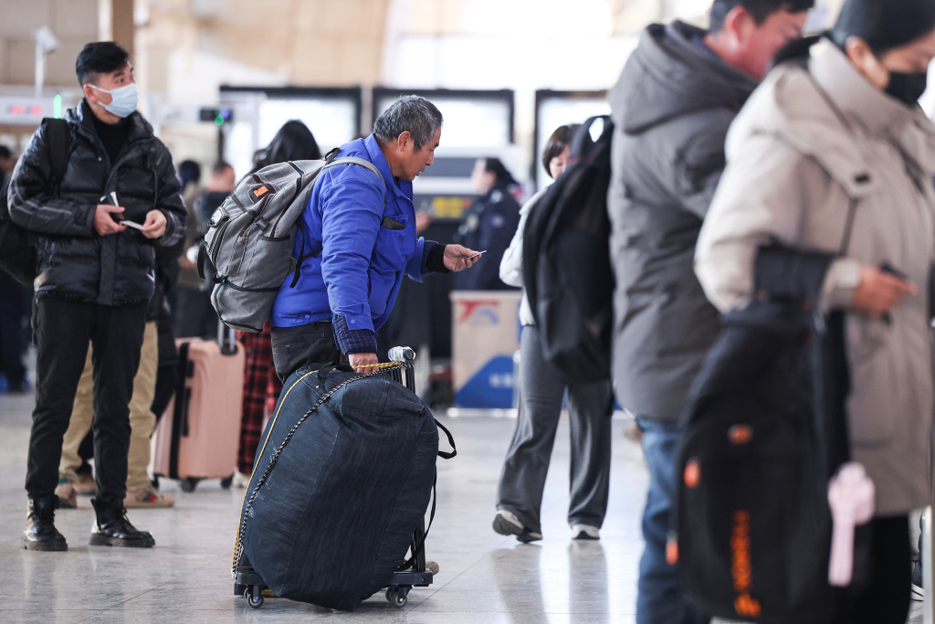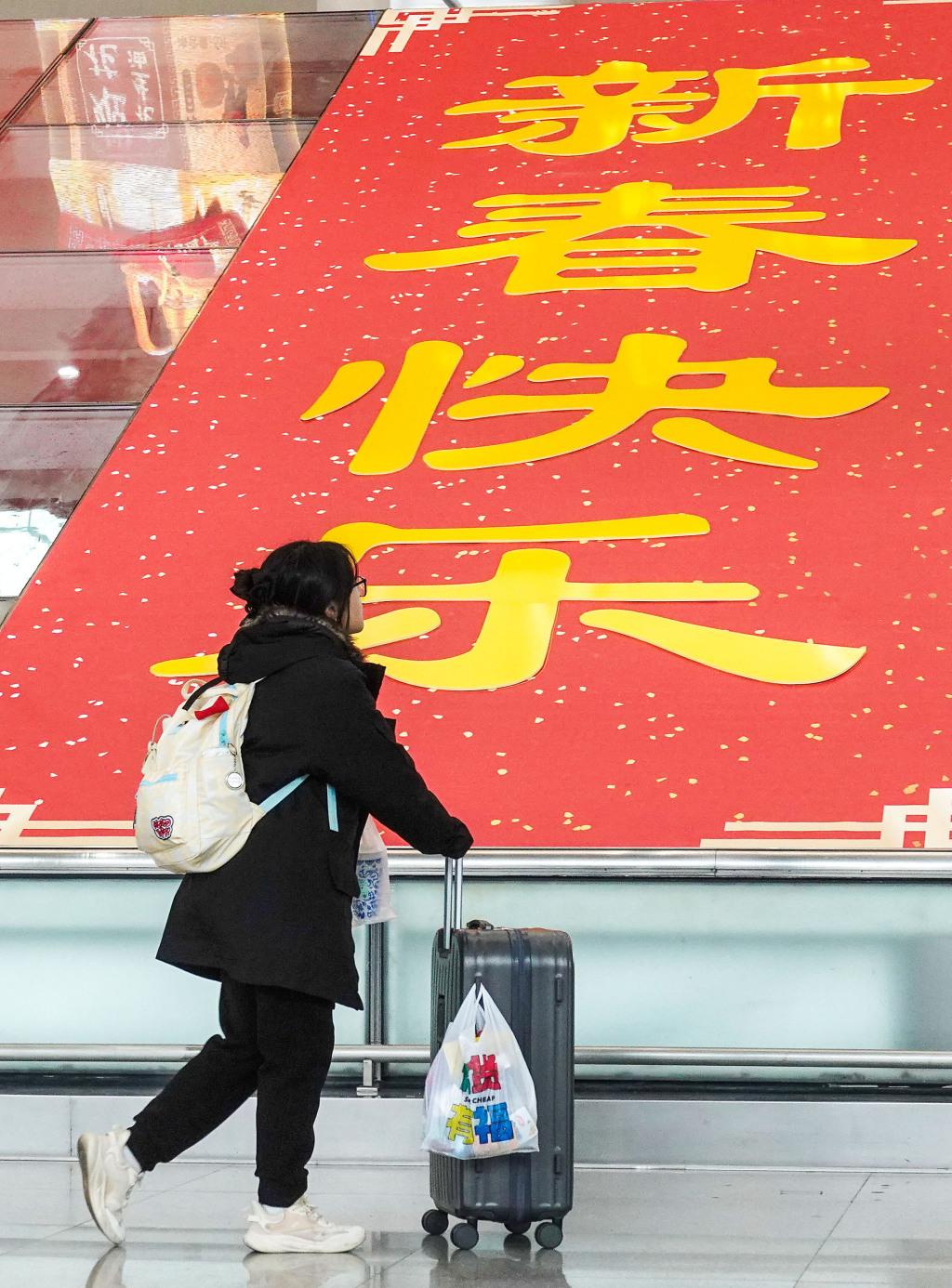 2025年1月14日,在南宁火车站,乘客们带着书包带着行李来到候车大厅,随行的行李里还带着回家路上的零食。“春节快乐”这个巨大的词语让候车大厅看起来很开心,春节气氛也逐渐浓厚起来。视觉中国 图