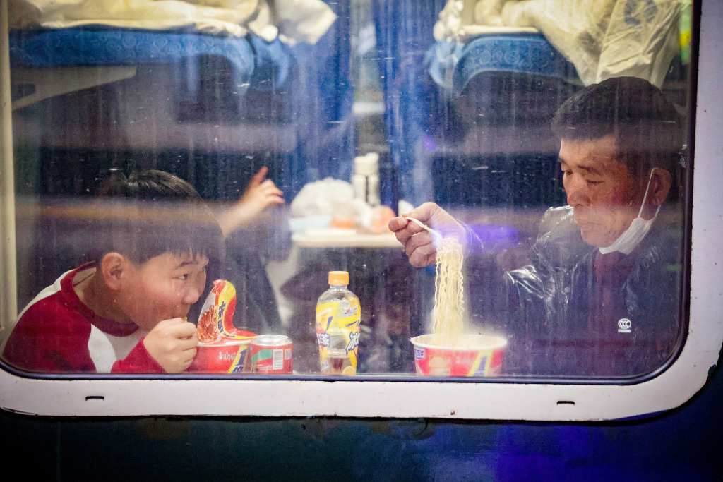 2025年1月13日深夜,北京西站,登车乘客正在吃方便面。新京报记者 王远征/视觉中国 图