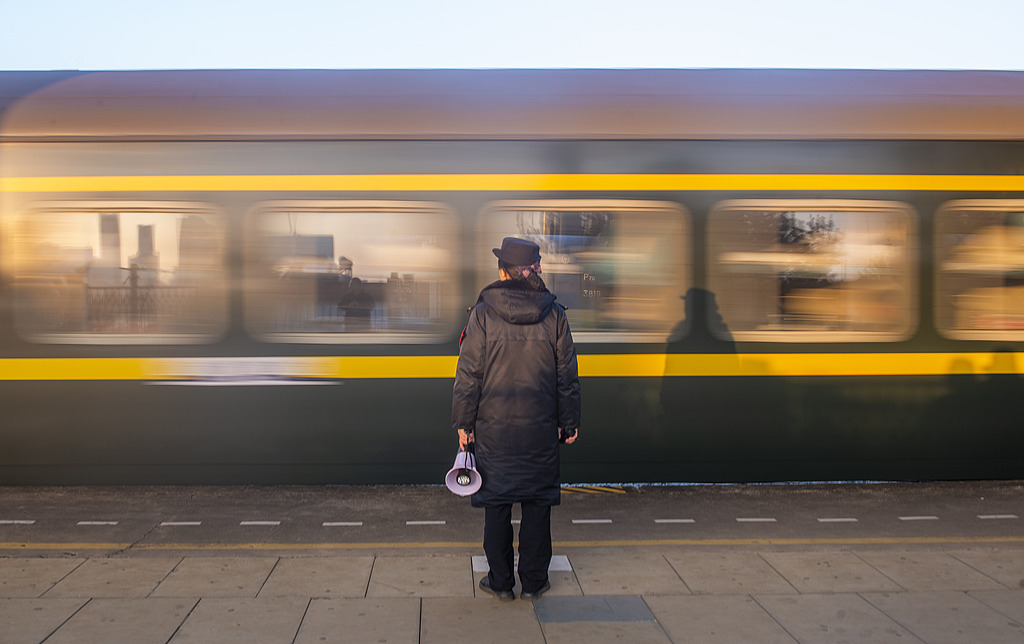 2025年1月14日,在湖南省永州市道县道州站,工作人员目送T582列火车。视觉中国 图
