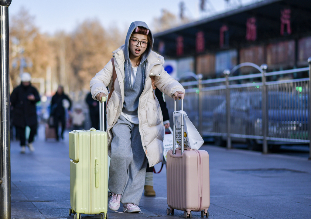 2025年1月14日,在济南火车站,背着书包的年轻女子向前奔跑,手里拿着两个行李箱,没有考虑到脚底散落的鞋绳。视觉中国 图