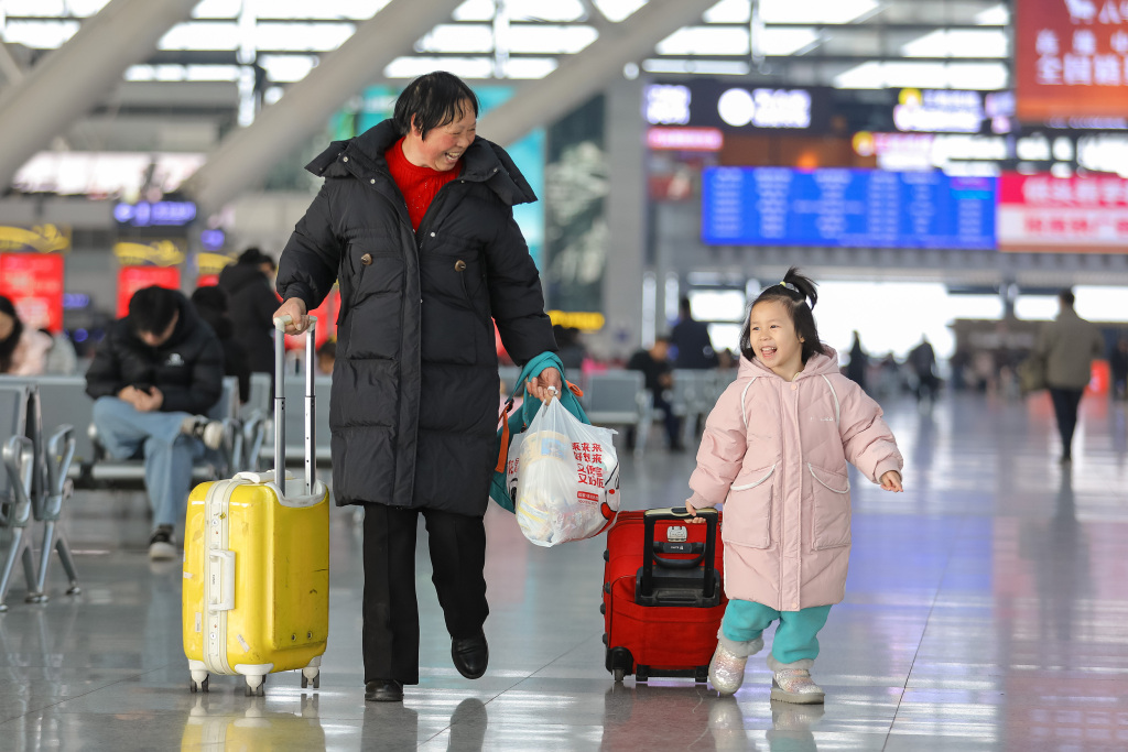 2025年1月14日,山东青岛火车北站,一老一小两名乘客各拖行李在候车室,面带微笑。视觉中国 图