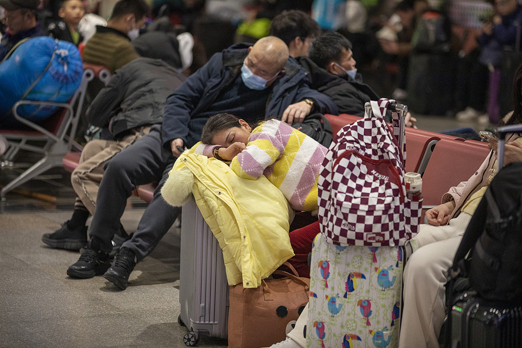 2025年1月13日晚,北京西站将于2025年春运高峰第二天凌晨开始,乘客将在候车室里收拾行李睡觉。视觉中国 图