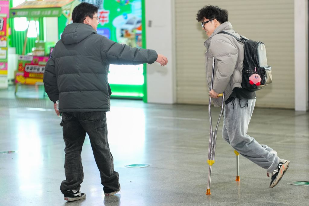 在长沙南站,市民刘先生(左)于2025年1月14日在出口迎接拄着拐杖的朋友。新华社记者 陈泽国 摄