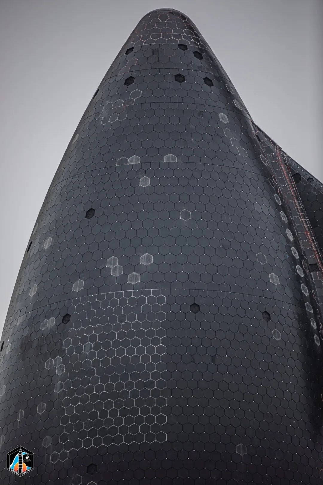 在S33的隔热瓦中,可以看到一些隔热瓦是故意薄化的,以测试底层备用隔热瓦。 | Starbase Surfer