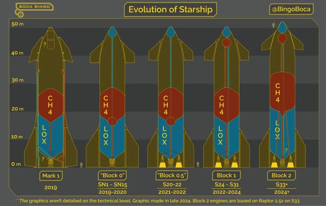 各版星舰二级推进剂储箱设计,V2版显著增加 | BingoBoca