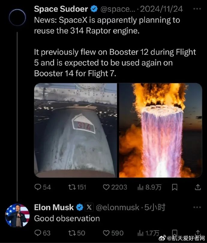 本人证实,314号猛禽发动机已被重复使用 | X截图