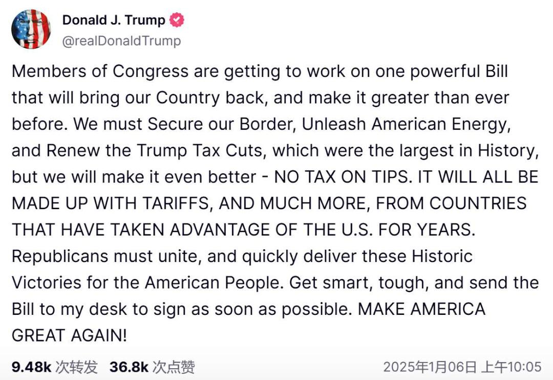 最近,特朗普在“真相社交”(Truth Social)根据上一篇文章,他提出了2017年边境问题、美国能源生产和即将到期的减税政策 法案所需的资金将由向其他国家征收关税来填补,这是一项强有力的法案。