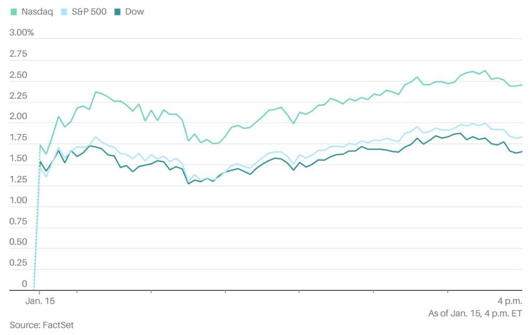 周三(1月15日),标准普尔500指数上涨1.8%,收于5949点,创下10周以来最大单日涨幅。道琼斯工业平均指数上涨703点,上涨1.7%,收于43221点。纳斯达克综合指数上涨2.5%。三大股指均创下特朗普获胜以来最大单日百分比上涨。