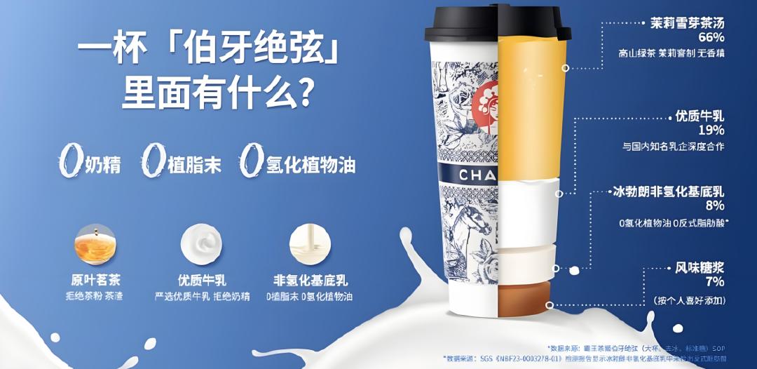 毕竟对于消费者来说,无论是过去霸王茶姬的“低GI”logo,还是公开“伯牙绝弦”等主要产品的配方和成分比例,都是推广的。 “0奶精、0植物脂末、0氢化植物油”等操作,在消费者心目中成功塑造了品牌“健康”的标志。