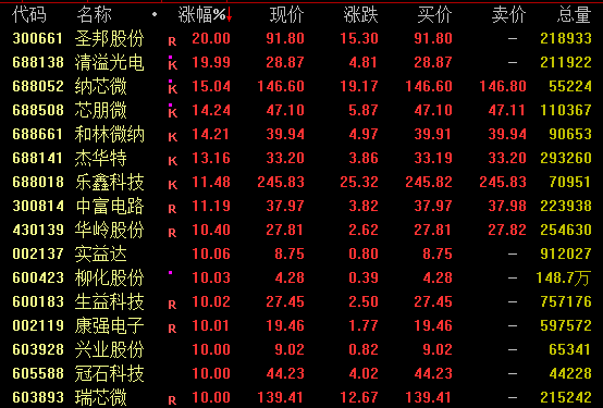 半导体和芯片股大幅上涨。截至收盘,圣邦股份和溢流光电涨停20%,纳芯小幅上涨15%以上,乐心科技涨停10%以上,实益达、柳化股份、康强电子、瑞芯微等多只股票涨停;中芯a股涨幅超过6%,全日成交额超过110亿元,在a股成交额中排名第二。