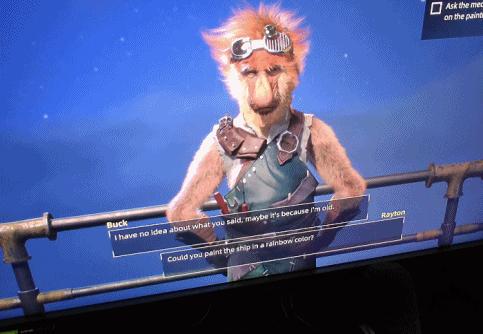 在此,我们需要修改宇宙飞船的颜色,但图片中没有传统的调色板界面,只有对话字幕。