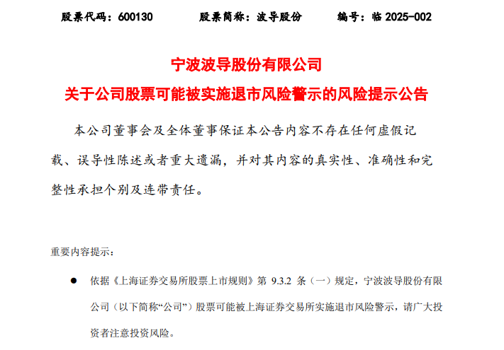 1月17日晚,曾以“波导手机-手机中的战斗机”著称的波导股份(600130)宣布,公司股份可能在2024年年度报告披露后实施退市风险警示,即在公司股份简称前添加“*ST”。