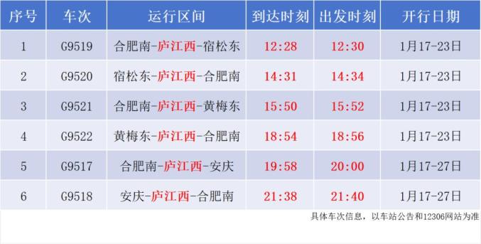 请关注12306网站和“庐江高铁西站综合管理服务中心”微信微信官方账号,提前合理安排行程。庐江高铁西站地下车库30分钟内(含30分钟)免费停车,新能源汽车每天免费停车2次(每次不超过5小时)。