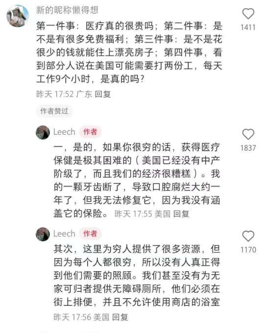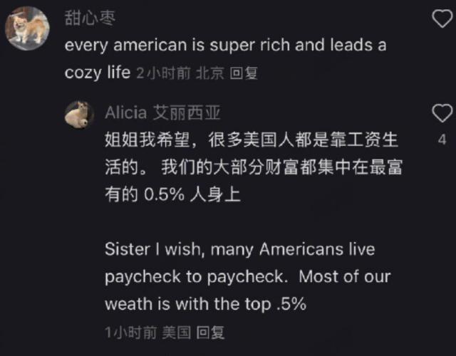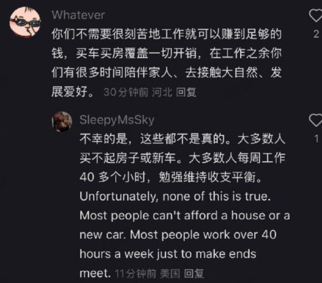 他们第一次知道,在很多中国人的心目中,美国其实是“梦中天堂”和“中奸”描述的美国——每个人都住在大家的脑海里。 house、刷盘子三个月就能买房,人均年收入四五万美元,随便吃牛排,到处都是“一美元炸鸡”...美国人破防了,问:“你说的是哪个美国?”你们说谁有四五万的收入?有这么好的工作赶紧介绍给我!我也是美国人,为什么我不知道自己生活在天堂里?