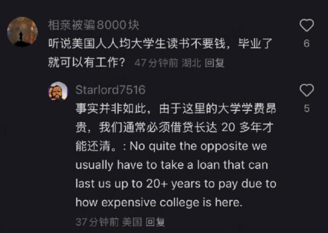 他们第一次知道,中国人的学费很低,从小学到初中都是义务教育。中国的大学费用只有几千元,所以他们不需要承担“学习贷款”,也不需要做任何“午餐贷款”。对于贫困生来说,国家有助学贷款,没有利息...中国公立学校是一所好学校,与美国完全相反。