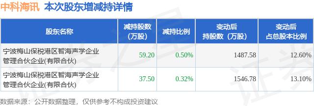 证券之星消息,1 月 17 日中科海讯发布公告《中科海讯》 : 关于持仓 5% 上述股东减持股份比例达到 1% 实施减持股份计划的通知》,其股东宁波梅山保税港区智海声学企业管理合伙企业 ( 有限合伙 ) 于 2025 年 1 月 14 日到 2025 年 1 月 16 白日合计减持 96.7 万股,占公司当前总股本的一万股。 0.8192%,股票在变化期间上涨。 0.45%,截至 1 月 16 日收盘报 17.98 元。