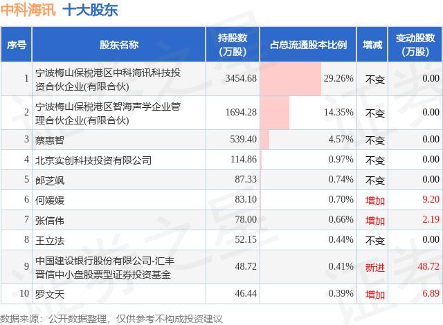 依据中科海讯 2024 第三季度报告公布的十大股东详细信息如下: