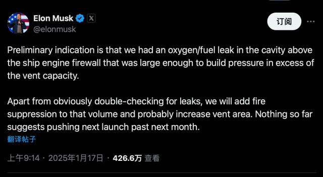 ▲北京时间 1 月 17 日早上 9:星舰第七飞发射14 3 一个半小时后,马斯克 X 在平台上发文称:「最初的迹象表明,氧气出现在飞船发动机防火罩上方。 / 燃料泄漏,泄漏足以使压力超过通风能力。除进一步检查泄漏外,我们还将在该地区增加灭火装置,并且可以扩大通风面积。现在没有任何迹象表明下一次发射需要推迟到下个月以后。」