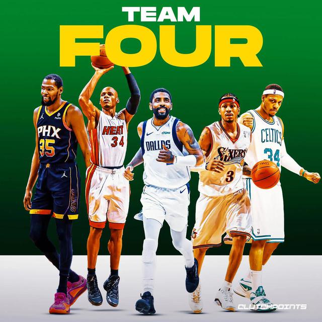五人组由艾弗森、欧文、雷阿伦、皮尔斯和杜兰特组成。三个后卫加上两个锋线,都是中远投和一流球员。问题是他们的内线真的很弱。