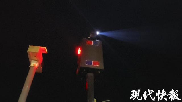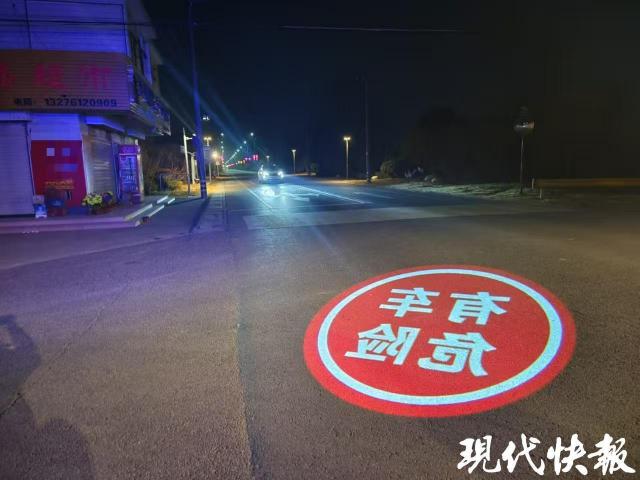 现在回乡的大车流就要来了,万爱品带着大队民警早早地准备好了。夜里 10 点多,在大队辖区黄新线和牡丹大道的十字路口,记者看到,当机动车和非机动车同时要经过十字路口时,路面上会突然出现一个红色的圆形投影,上面写着“有车危险”。据报道,这是最近刚刚安装试运行的“十字路口哨兵警示系统”,即在十字路口安装“红外线” 语音 通过声、光、电等方式投射“预警设备,可以有效防止机动车、电动自行车、行人因路口盲点造成的事故,使路口狭窄、遮挡较多的农村道路更加安全。