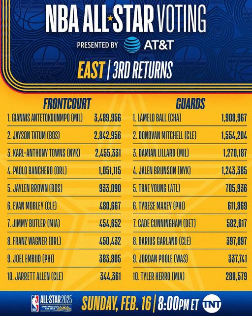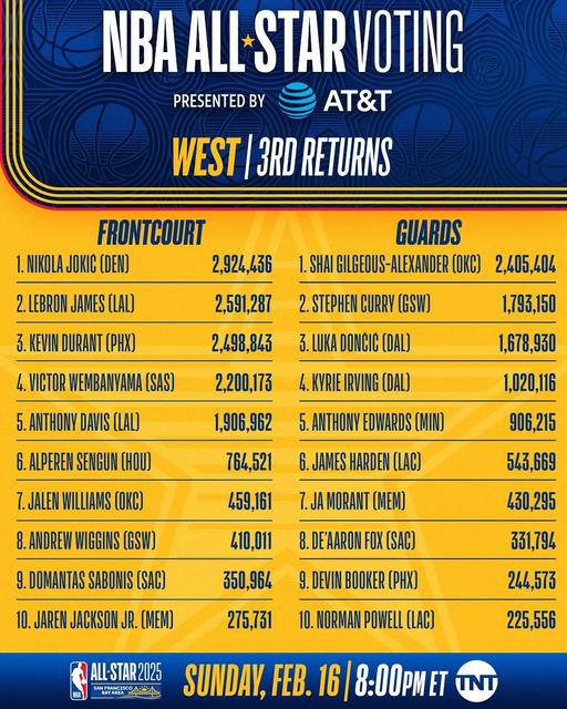 NBA全明星2025年第三轮最新投票结果公布,詹库杜情况如何?