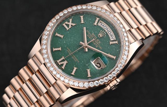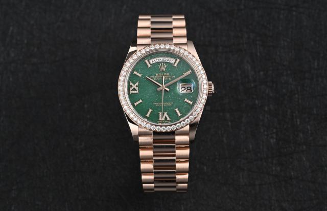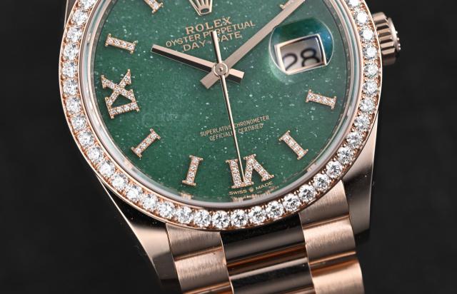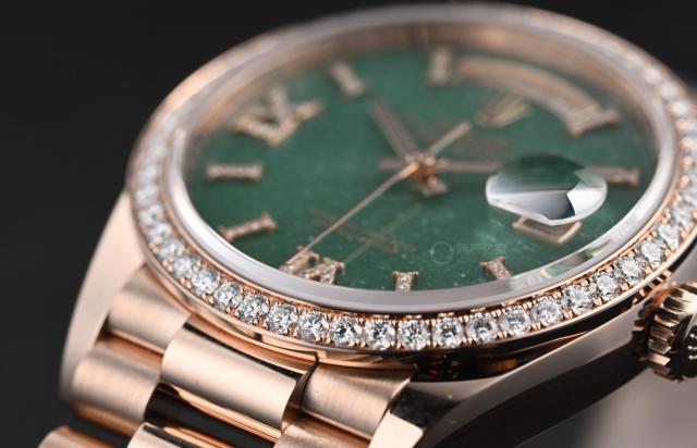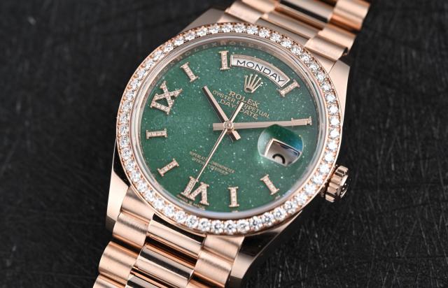 劳力士不断在盘面创新中加入各种新元素。特殊盘面的劳力士不仅有独特的升值空间,还展现了自己的“硬”实力。因此,各种特殊盘面的手表在购买时往往充满竞争力,甚至在二手市场上也有严重的溢价。劳力士是最经典的劳力士。 DD(星期日历型)系列,劳力士几乎每年都会为该系列推出新的特殊盘面设计作品。基础款的 DD(周日历型)系列本身的价格已经很高了。同时,劳力士可以通过将特殊磁盘引入系列来看到对这个系列有多高的价格和信心。就比如这款 2023 年度日历型 36 绿砂金石表(型号:m128345rbr-0068)。
