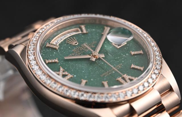 虽然合成砂金石现在很常见,而且由于制造简单,在表盘中的使用也越来越普遍和便宜,但由于其稀缺性,天然砂金石自古以来就被用作高档材料,手表中使用天然砂金石的手表很少。劳力士 DD 该系列采用贵金属和稀缺材料制作而成,将绿色砂金石应用于该系列更是十分契合。虽然不同于人工合成的砂金石盘面一般光滑无瑕,但这种带有自然纹理的“印记”通常是顶级的。