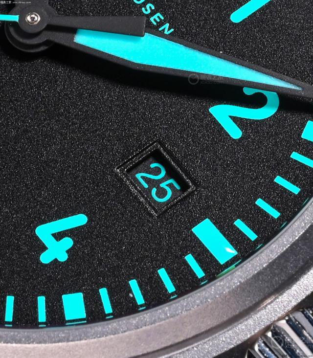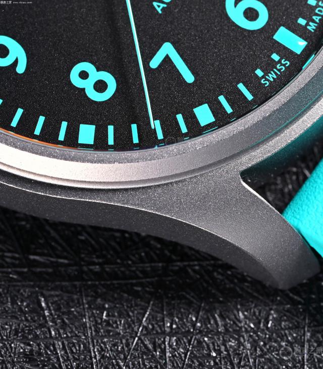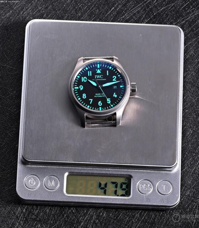 除盘面外,马克 20 “马石油”,尺寸与常规型号相同,均为 40 mm,但是使用了钛壳。钛壳,首先是轻的。马克 20 “马石油”表头的重量, 47.9 安装表带的整个表带也就是 70 多克。钛壳全部喷砂工艺,表壳、表圈、表耳、倒角部分,全部为喷砂颗粒质感。重量轻,本身是大三针,10.6 mm厚度,在运动表中也算比较薄,配戴感觉很好。100 大米防水,日常生活很充足。