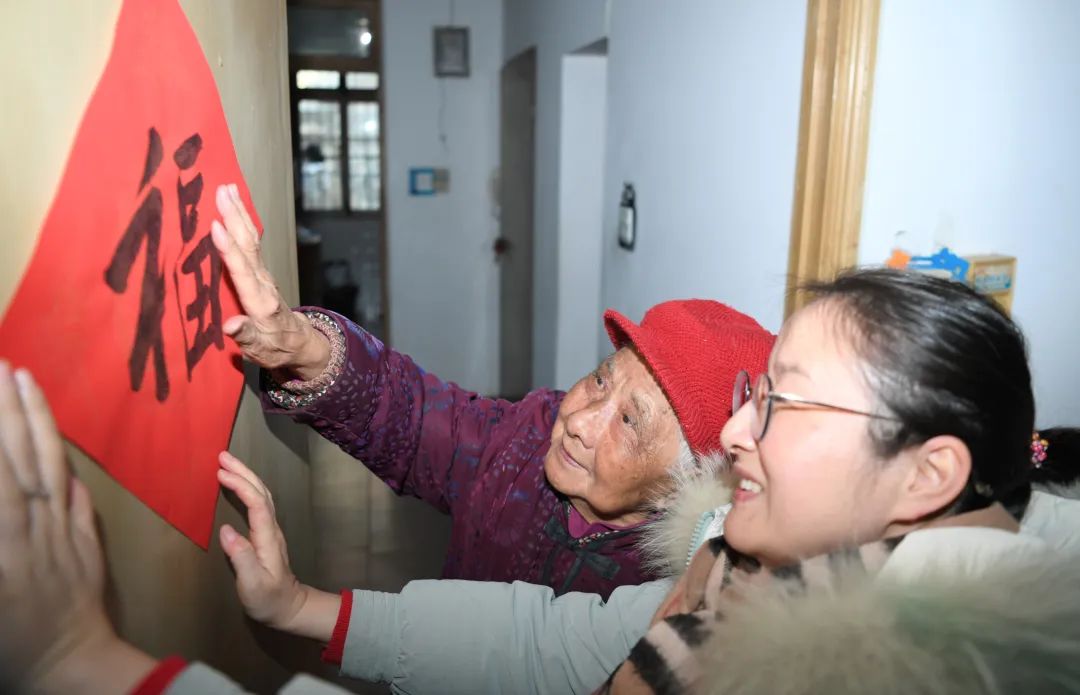 志愿者来到琥珀街北苑村社区,为空巢老人送上福字。