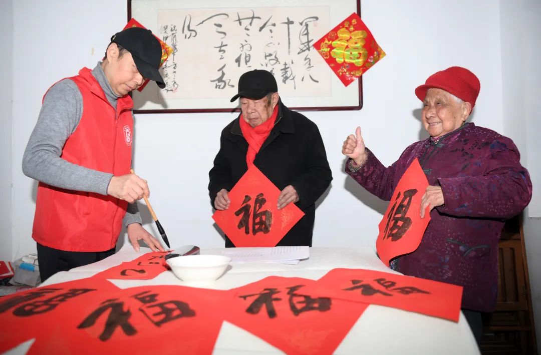 小庙镇段冲村,书法爱好者为乡亲们义写春联送上“福气”。