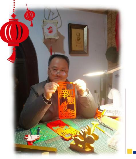 就这样,在家人的影响下,杨永来也拿起剪刀,开始了与剪纸的半生牵绊。他说:“那些聪明的花鸟鱼虫,不同形状的人,像魔法一样吸引着我。剪纸对我来说不仅仅是一门技能。它是我情感的寄托,是我与传统文化对话的桥梁,承载着我对生活的热爱和感悟。”