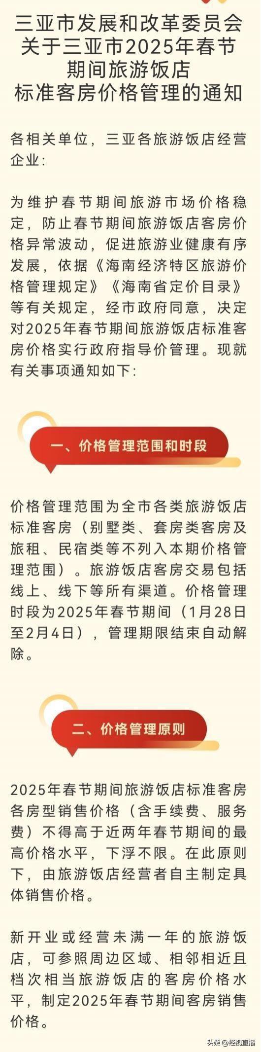 2024年,三亚市发改委一名工作人员通知经视直播记者。 年 12 他们在月份发布了《关于三亚市的问题》 2025 2008年春节期间,旅游餐厅标准客房价格管理通知书要求实施房价报告,所有酒店同户型价格不得超过近两年同期。“每个酒店都报告了今年标准房间要卖的价格,其备案价格不得高于 2023、2024 春节期间销售价格最高。"