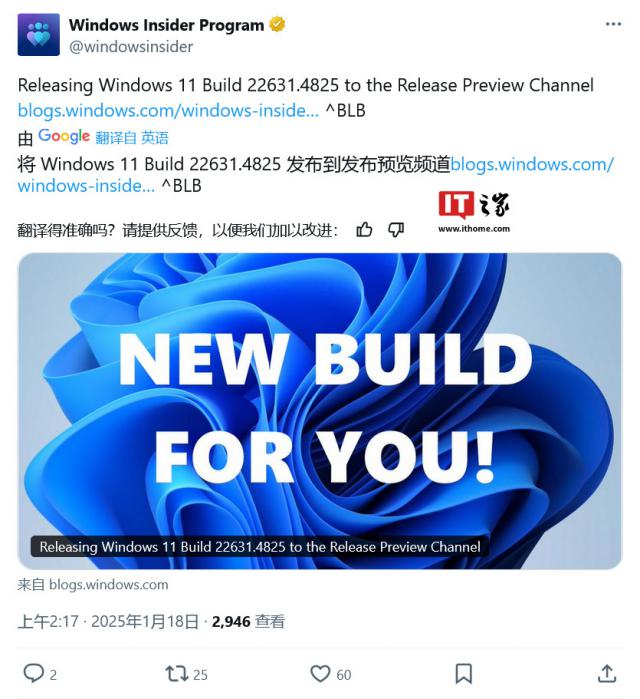 IT 世家 1 月 18 今日消息,微软企业(1 月 18 日本)发布博文,面向 Release Preview 频道的 Windows Insider 项目成员,适用于发布 Windows 11 23H2 的 KB5050092 更新,客户安装后版本号升级到客户 Build 22631.4825。