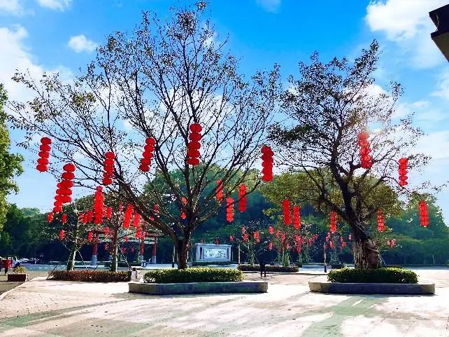 高高挂起的大红灯笼将公园装扮得喜气洋洋。