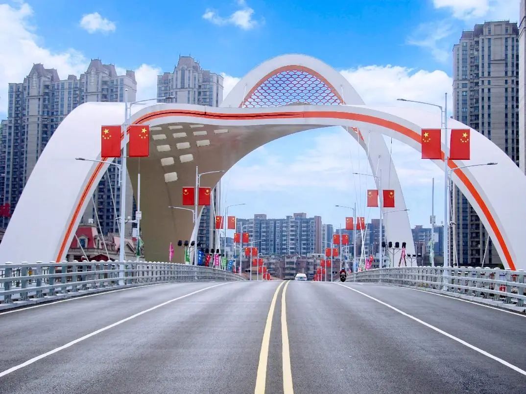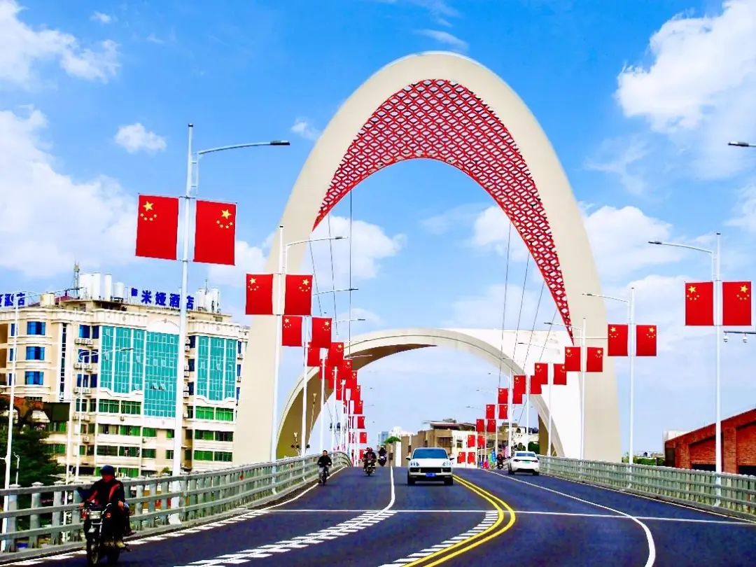 新鲜的红色国旗整齐地悬挂在船厂跨江大桥两侧,在微风中迎风飘扬,与大桥雄伟的姿态相映成趣。欢迎市民朋友打卡江门新地标。