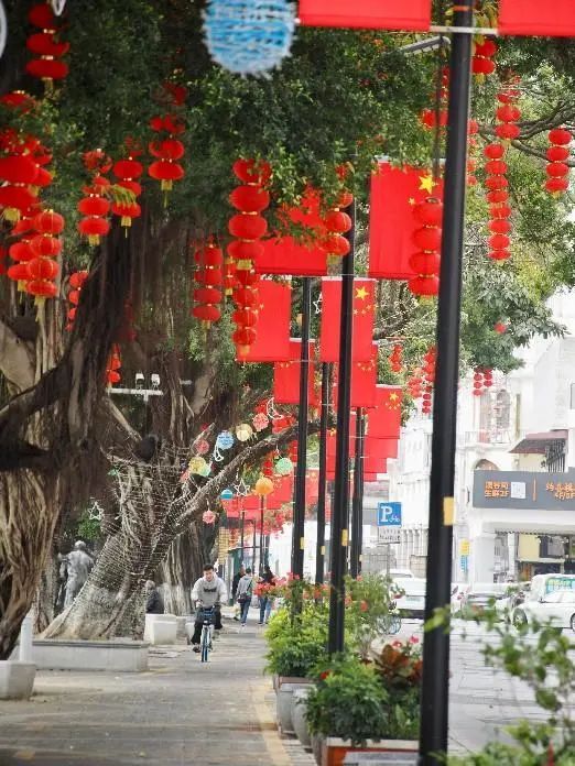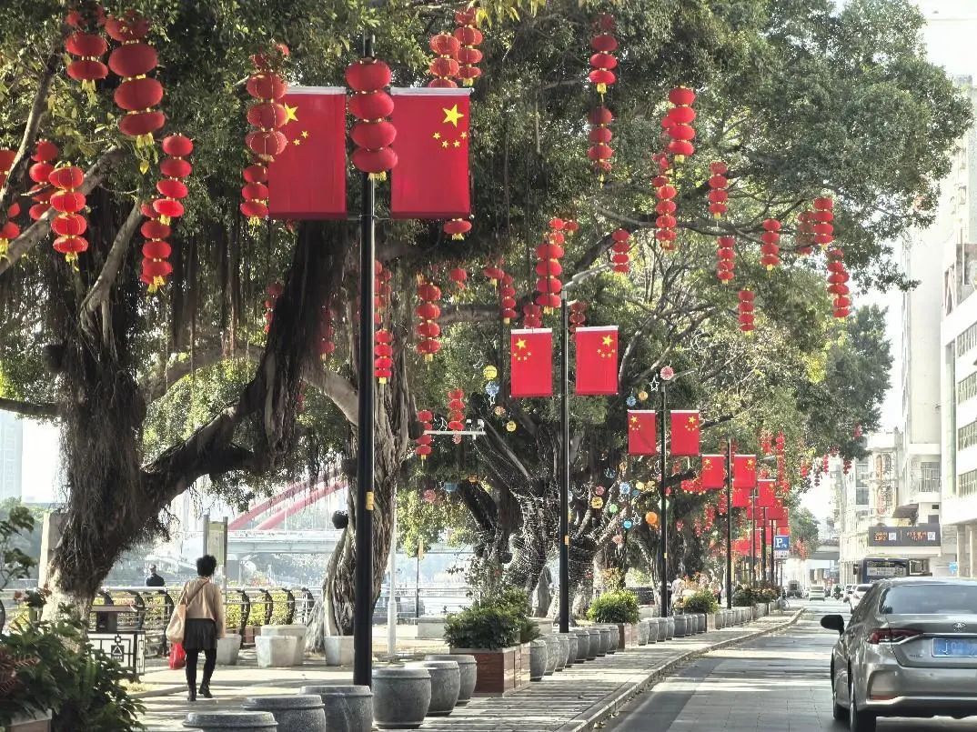 在主次干道上,一抹“中国红”明亮而快乐,鲜艳的国旗和喜庆的灯笼相互辉映,向市民传递着浓浓的节日祝福,呈现出蓬江的“新年气象”。