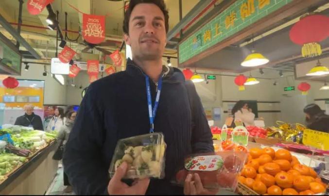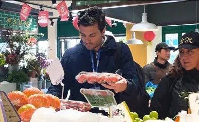 在水果摊前,来自西班牙的安卓指向盒子里的干柿子,问这是什么。导游向他解释说,这是干柿子,比新鲜柿子甜,可以储存更长时间。安卓说:“我只吃过新鲜的柿子,这是我第一次看到干柿子。”。